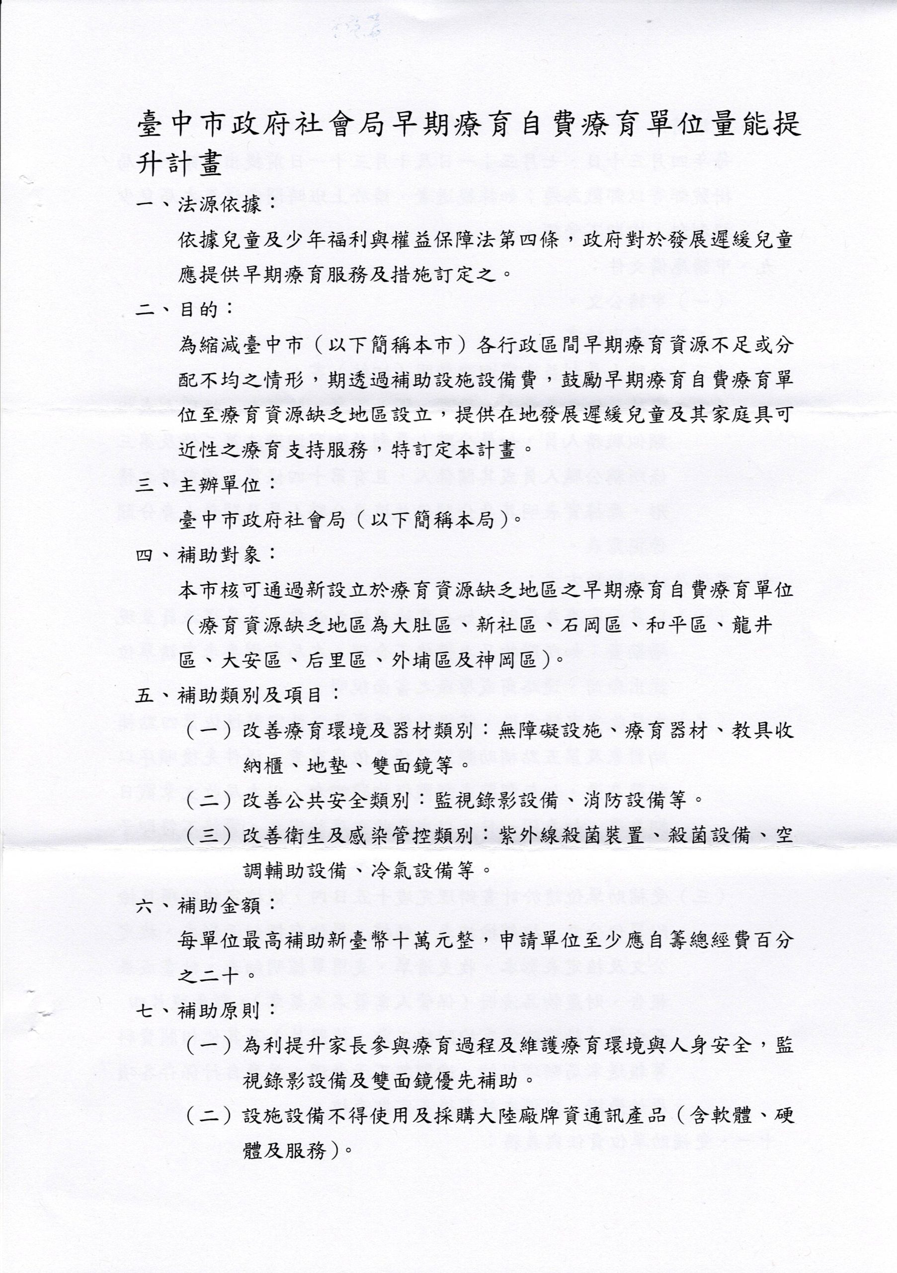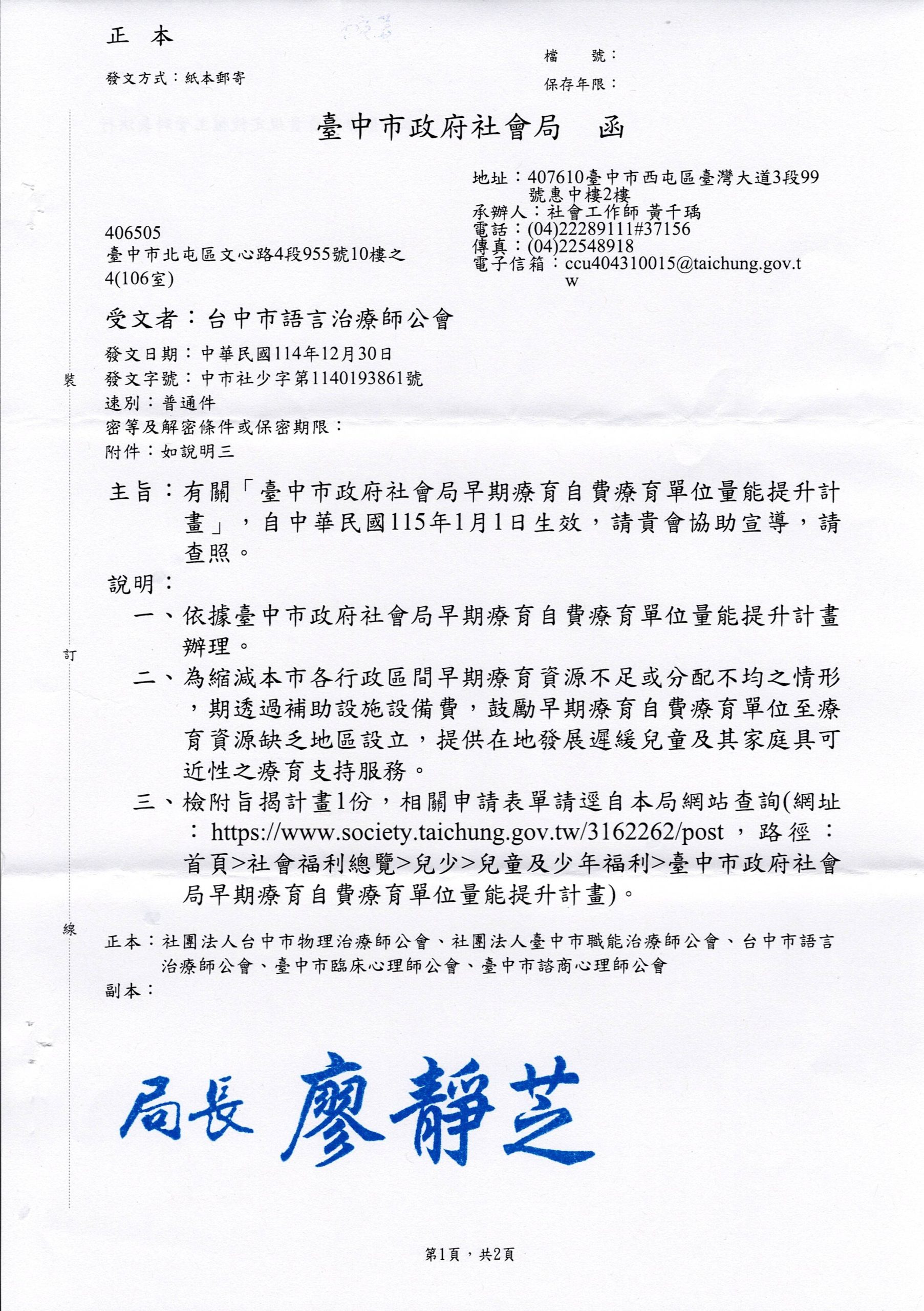 【公文】早療自費單位量能提升計畫作者: tcslp / 2026 年 1 月 2 日 說明:有關「台中市政府社會局早期療育自費療育單位量能提升計畫」,自民國115年1月1 日生效。 公文及計畫內容請會員詳閱~