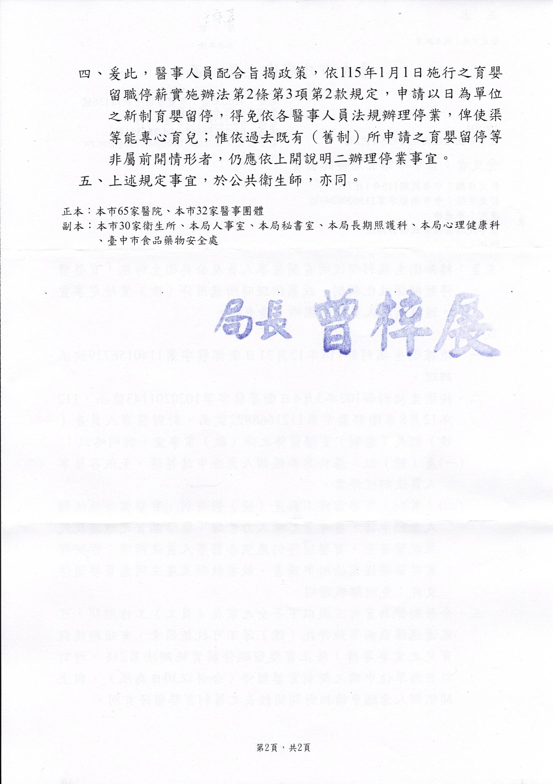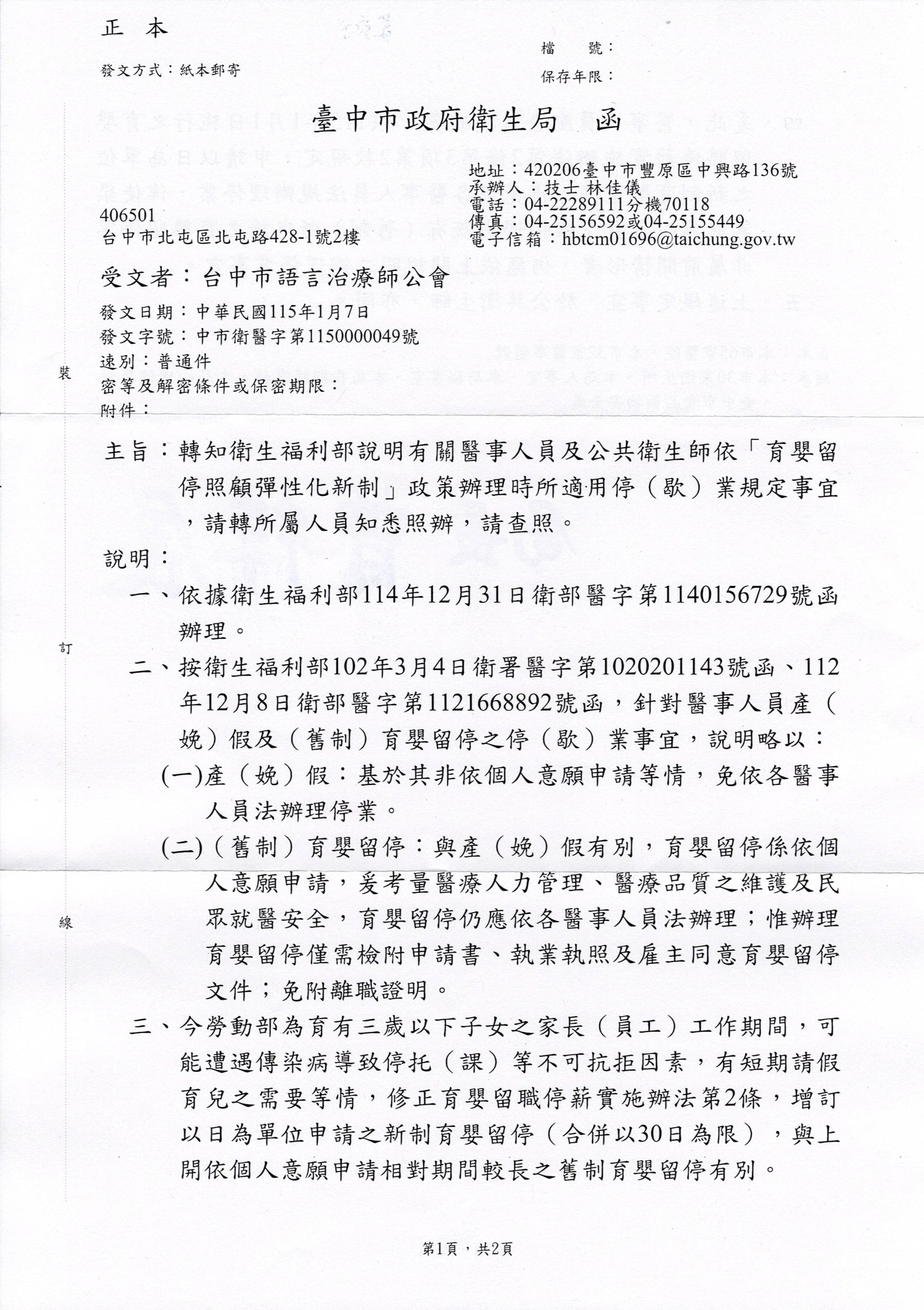 主旨:轉知衛生福利部說明有關醫事人員及公共衛生師依「育嬰留停照顧彈性化新制」政策辦理時所適用停( 歇)業規定事宜。
