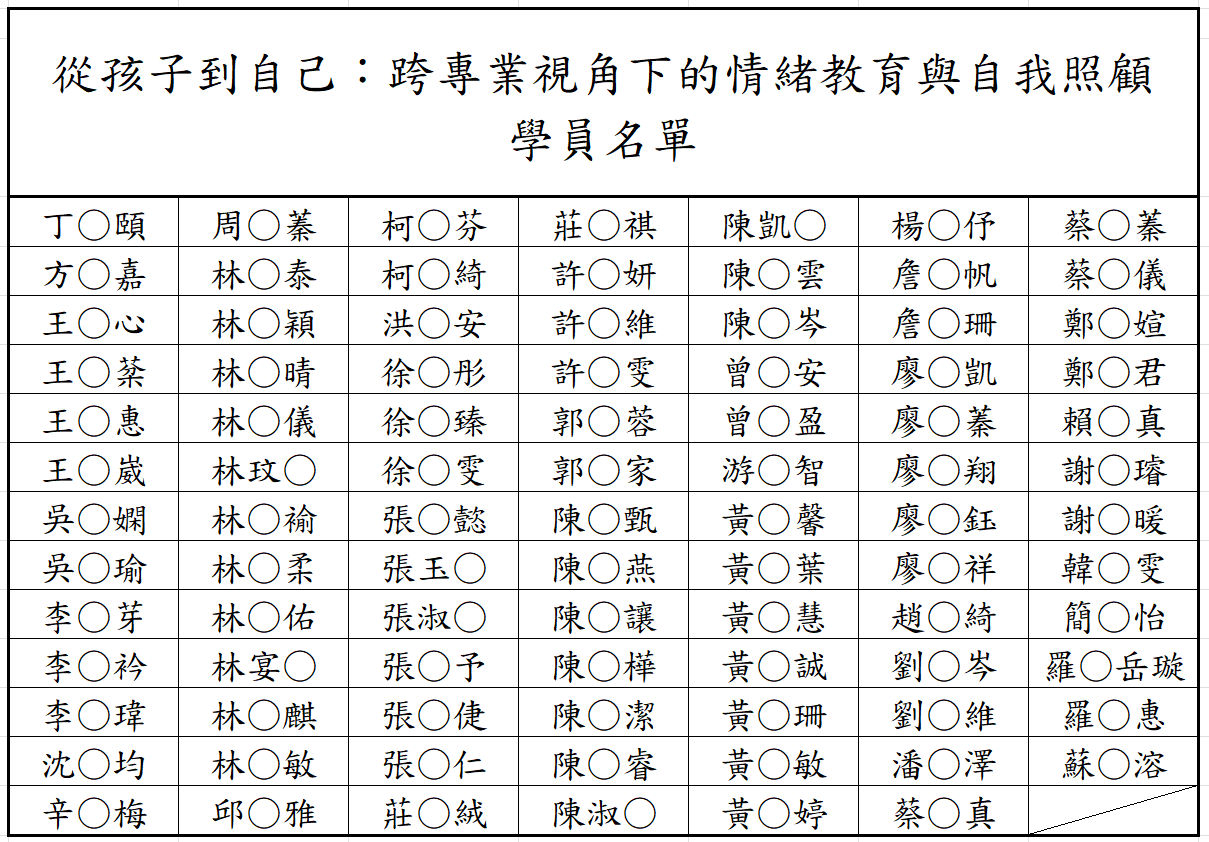 12/7從孩子到自己:跨專業視角下的情緒教育與自我照顧研習學員名單作者: tcslp / 2025 年 12 月 1 日 研習時間:114年12月07日(星期日) 08:40~16:20 研習地點:中山醫學大學正心樓0212教室(2樓) 請有報名的學員確認名單上是否有自己的名字,如有疑問歡迎撥打公會電話聯繫04-22470365