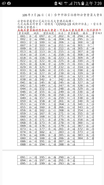 109年7月26日(日)台中市語言治療師公會會員大會報名完成名單